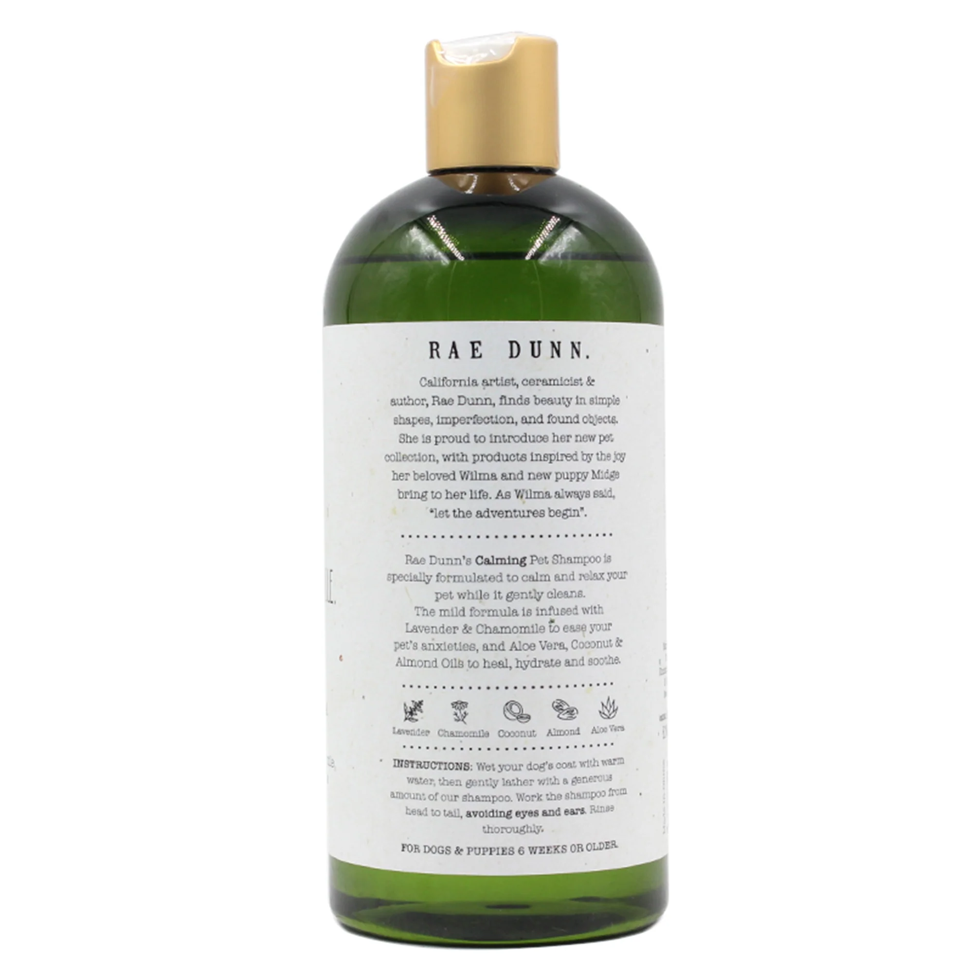 Calming Herbal Ingredients: Rae Dunn’s Calming Pet Shampoo is infused with Lavender and Chamomile, perfect for searches like ‘calming lavender pet shampoo’ and ‘chamomile dog wash’, designed to relax and soothe pets during bath time.